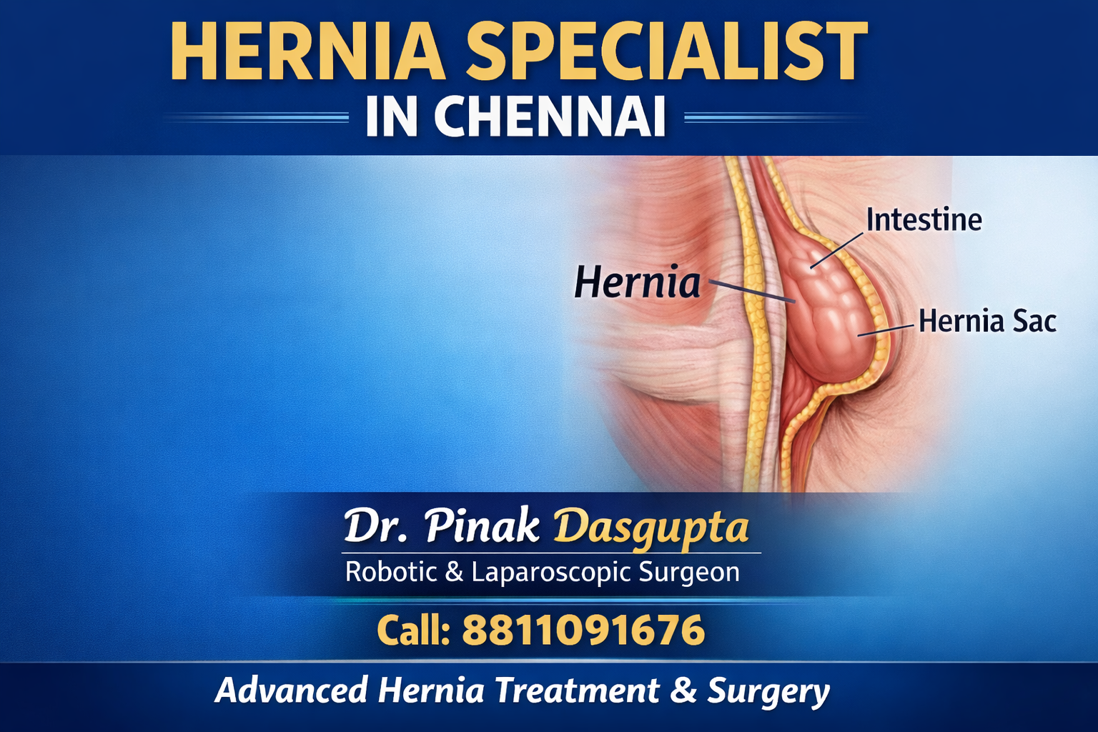 Get advanced and personalised hernia treatment in Chennai from a trusted expert. Consult Dr. Pinak Dasgupta, the leading hernia specialist in Chennai, for safe, effective, and minimally invasive care.